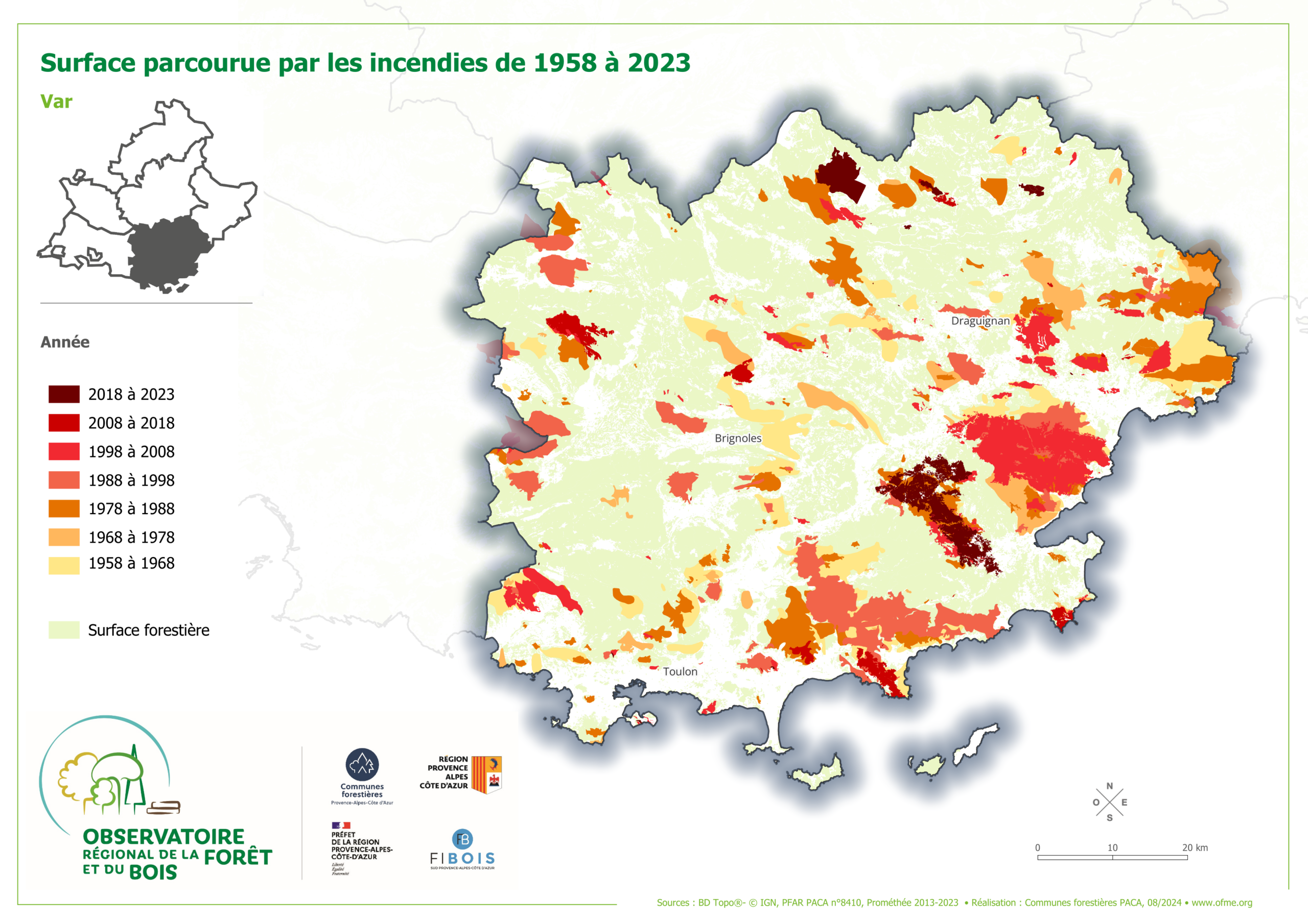 Surface parcourue par les incendies dans le département du Var de 1958 à 2023