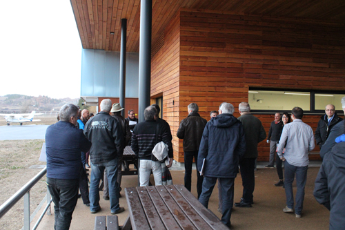 François Dufayard, l’architecte de ce bâtiment de 2 500 m², a rappelé immédiatement la nature du bâtiment de Polyaéro : une construction mêlant bois, béton et métal. Mais il s’agit aussi d’un projet à haute valeur environnementale pour beaucoup d’autres points que l’utilisation du bois certifié : bâtiment à énergie positive, panneaux photovoltaïques en toiture, plancher chauffant par chauffe-eau solaire, architecture bioclimatique, insertion dans le paysage de Tallard, etc. Chantal Larrouture du bureau d’étude ADRET et Sylvain Bertrand de la maîtrise d’ouvrage ont rappelé que cette démarche environnementale avait été mise en place dans le cadre d’un projet BDM (Bâtiment Durable Méditerranéen) qui a permis d’obtenir le niveau « OR » malgré un budget très encadré.