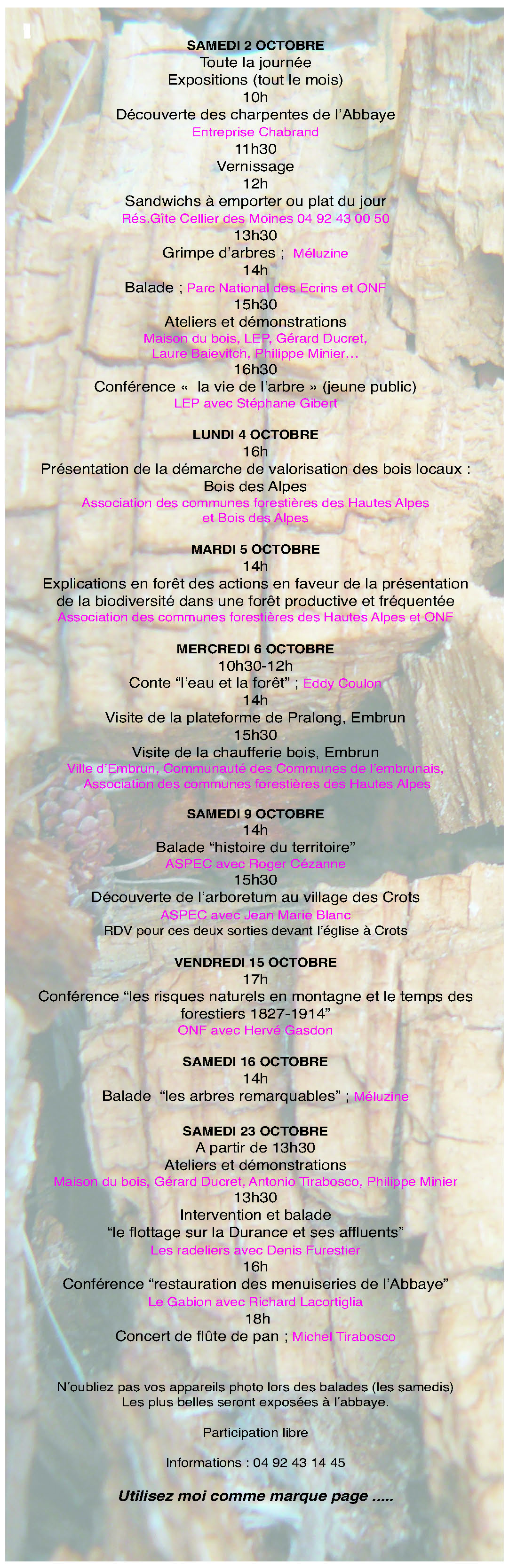 Ces deux événements s’inscrivent dans le cadre de la manifestation forestière locale Forêt, Bois et Patrimoine, organisée durant tout le mois d’octobre par l’Association des Amis de l’Abbaye de Boscodon. |